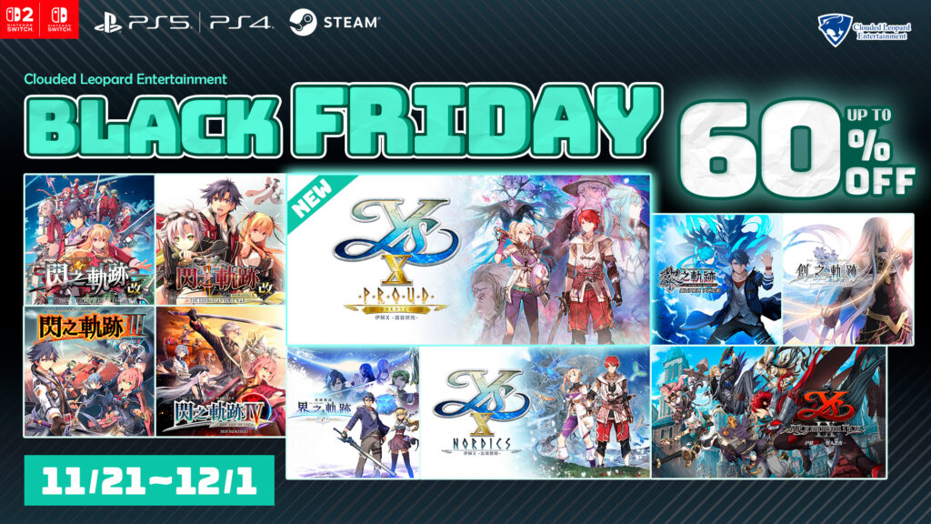 Clouded Leopard Entertainment Inc. (CEO: Yuen-Yuen Chen) is pleased to announce the CLE BLACK FRIDAY SALE 2025, which will run from now until Monday December 1, 2025. Ys X -Nordic Glory-, which is currently a strong seller across Asia. The Asian-language digital version gets first-time discount!! And more fan favorite games up to 80% off for a limited time! Now is the time to add some fan favorite games to your collection!