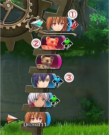 ①행동 중인 캐릭터②현재 타깃(색깔이 변함)③AT 보너스