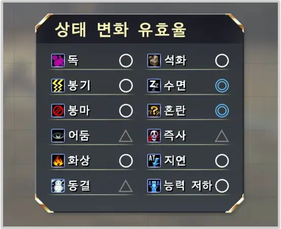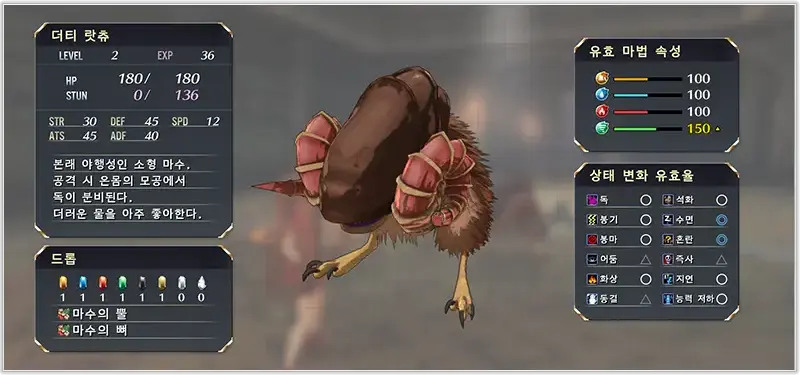 적을 선택하고 (으)로 상세 정보를 표시합니다. 각종 능력치나 마법 속성・상태 이상의 유효율 등을 알 수 있습니다.※아이템과 보조 설명은 스턴 혹은 격파 시에 개방됩니다.