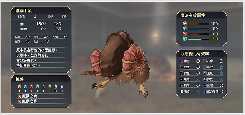 顯示詳細資訊。可以查看各項能力值、魔法屬性與狀態異常的有效率等。