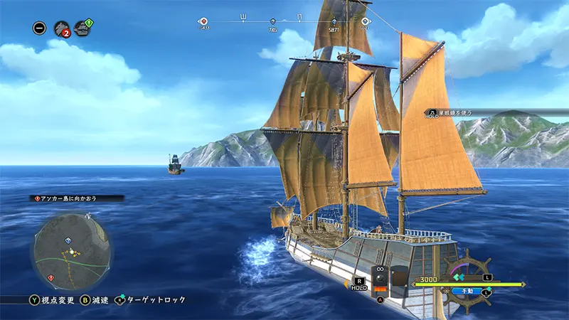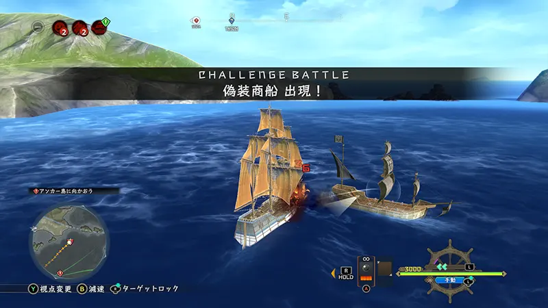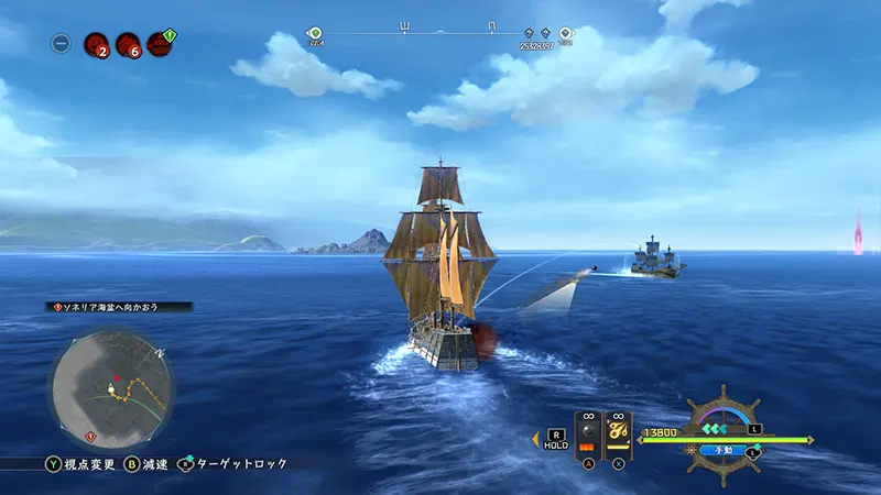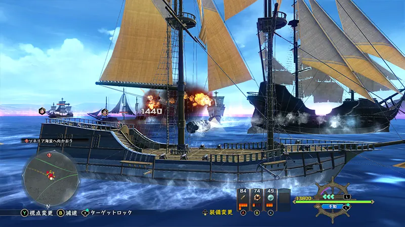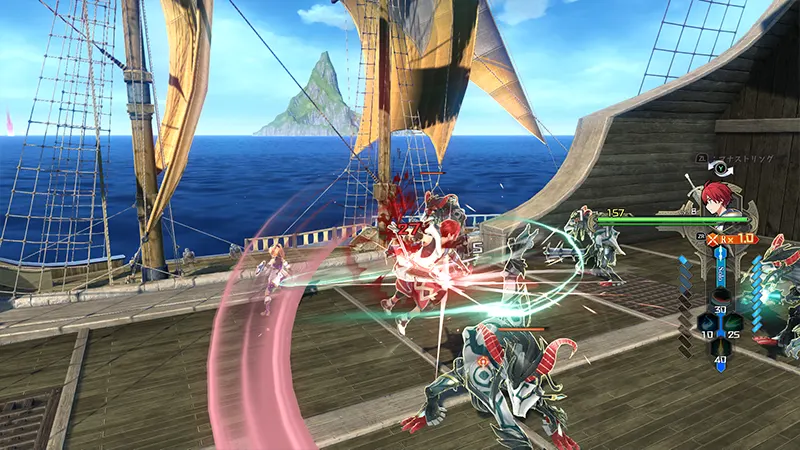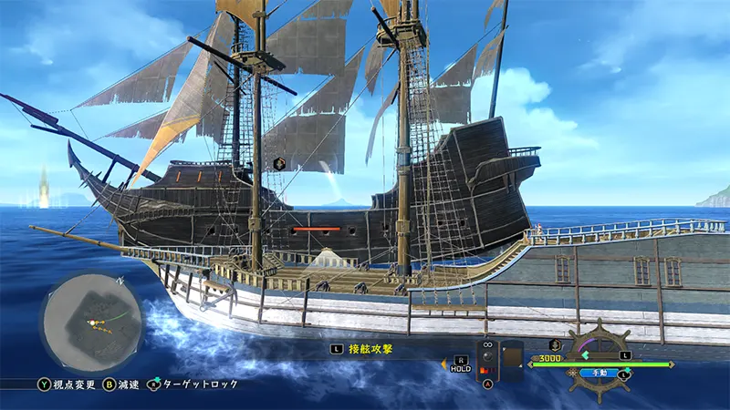 強大的敵船設有耐久值,一旦因桑德拉斯號的攻擊歸零便會停船。此時請趁機登上敵船,發動接舷攻擊吧!