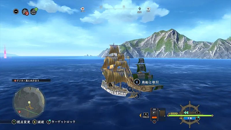 探索奧貝利亞灣時,有時會望見遠方的船影。此時若使用望遠鏡判斷對方為「商船」,就接舷與對方談生意吧!