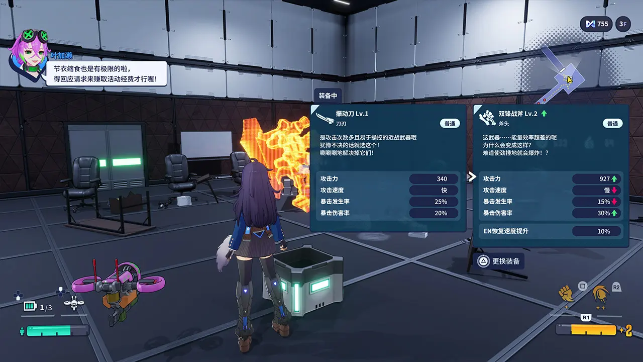 在战斗中从道具箱取得的装备或强化程序“MOD”可立刻装备使用,但若落败,重新出击时即会失去所有装备。另一方面,通过击倒敌人获得的材料或直播时的“打赏”则可持续累积,能活用在改造或强化能力上,两者都是为攻下最高楼层不可或缺的收集要素。