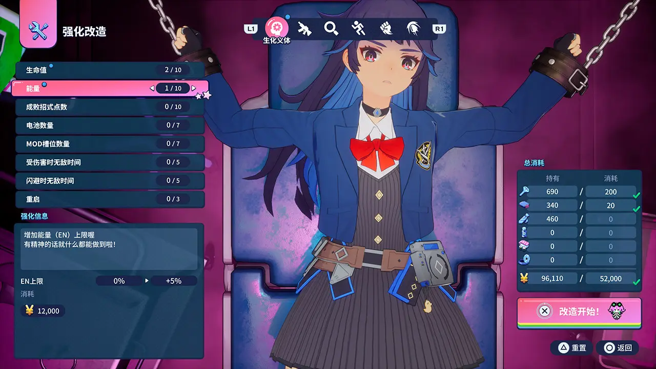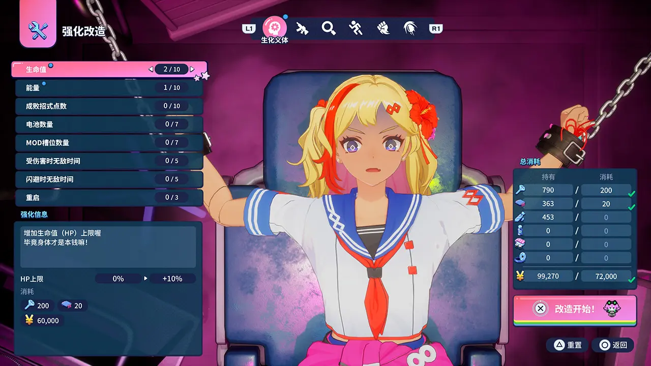 利用于战斗或直播中取得的材料与资金,可为机械少女进行强化与改造。可强化的要素丰富多样,除了装备新能力,也能进一步提升原有能力。开发了机械少女的“叶加濑博士”将使出浑身解数进行改造,安心地把自己交给博士吧。
