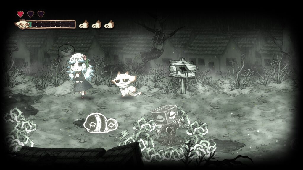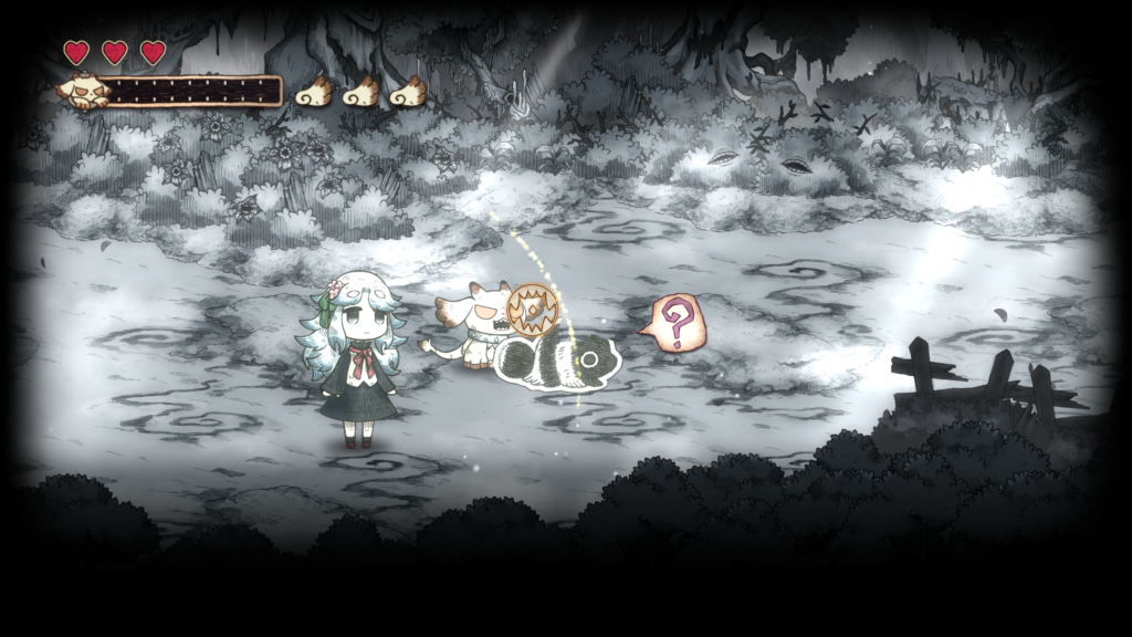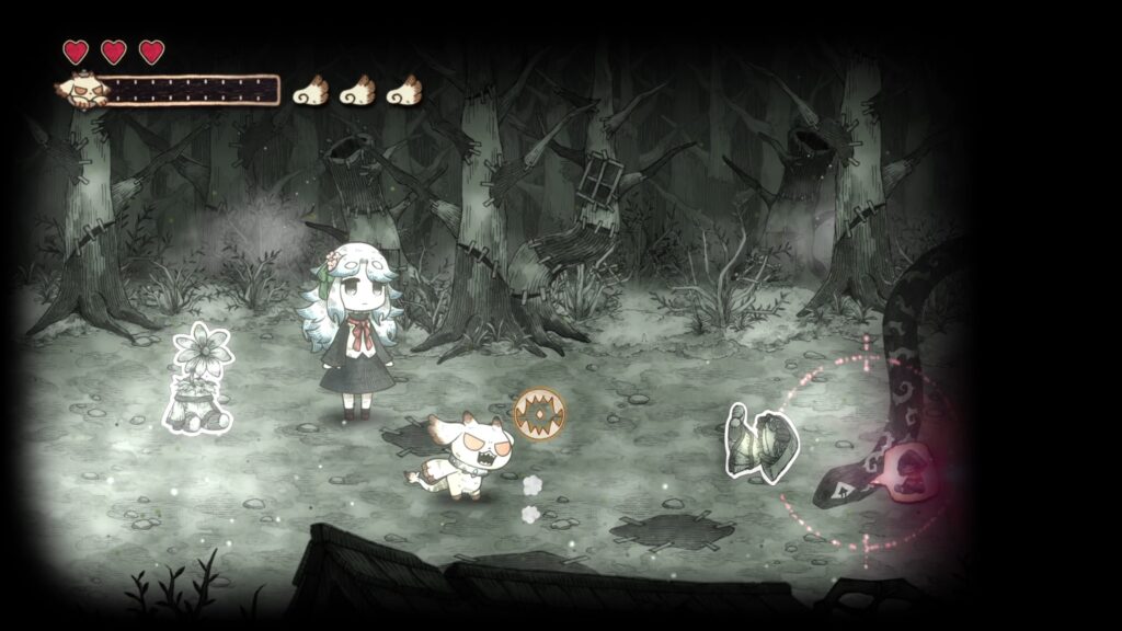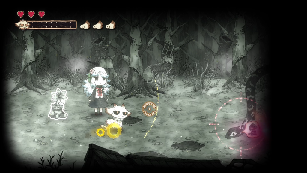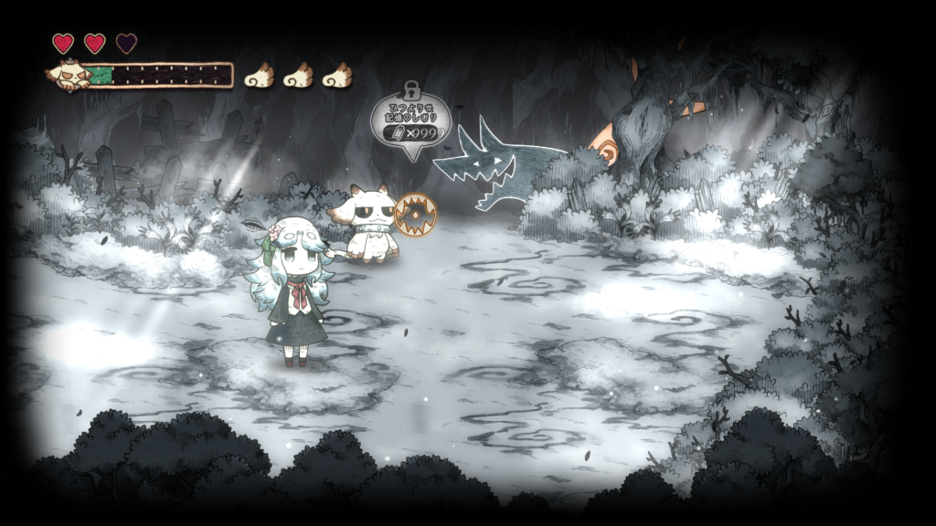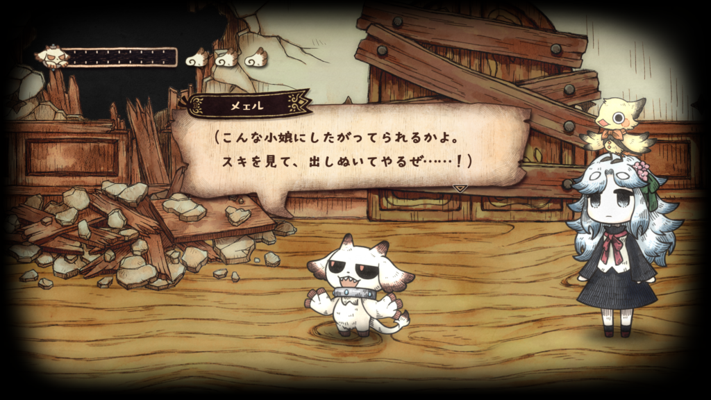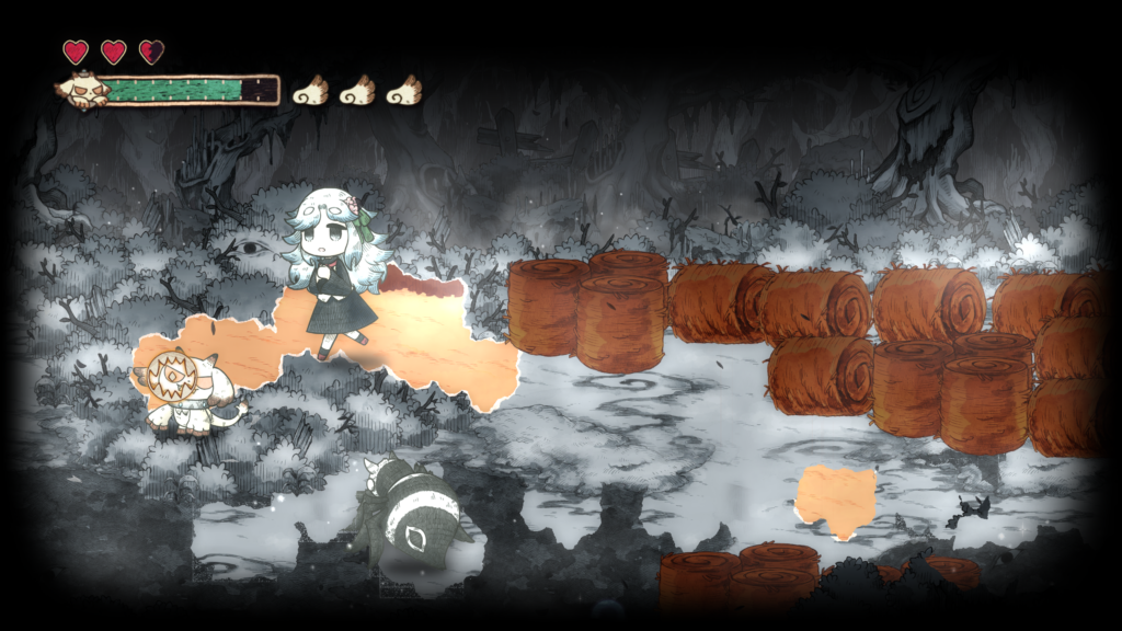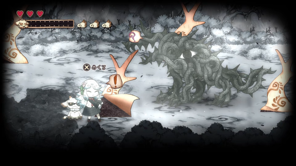 그림책 속 세계를 나아가다 보면, 메르가 힘을 되찾으면서 새로운 능력을 획득하게 됩니다. 메르의 새로운 능력 「붙이기」는 먹은 것을 던져 원거리에서 공격하거나, 대상에 붙여 복구할 수 있습니다.