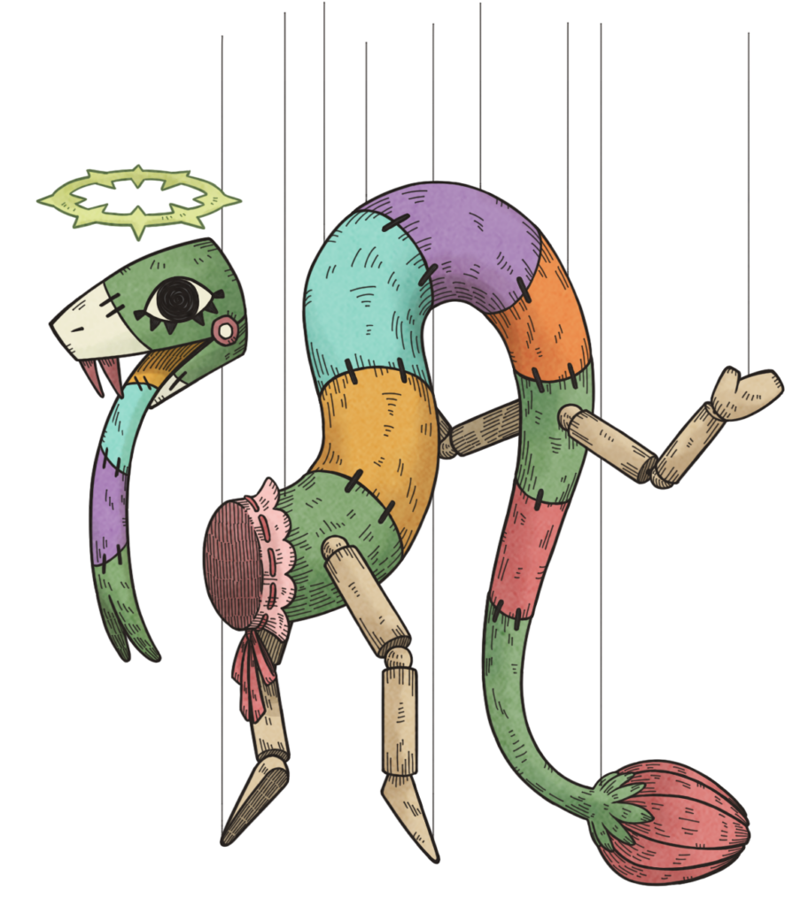 여러 가지 색깔의 조각을 이어 붙인 인형 같은 이형인 「얼기설기 공주」로 변이한 소녀.