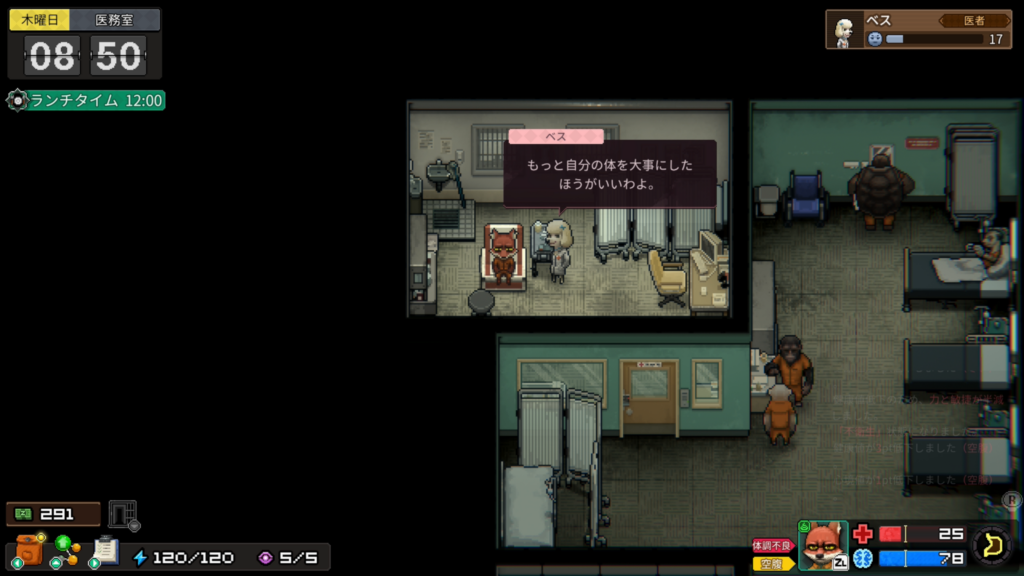 この刑務所の医務室に務める唯一の医師であり、受刑者全員の健康を管理しているが、毎日午後5時半に定時で退勤するので、彼女に会いたいのであれば、診察時間を間違えないようにしよう。