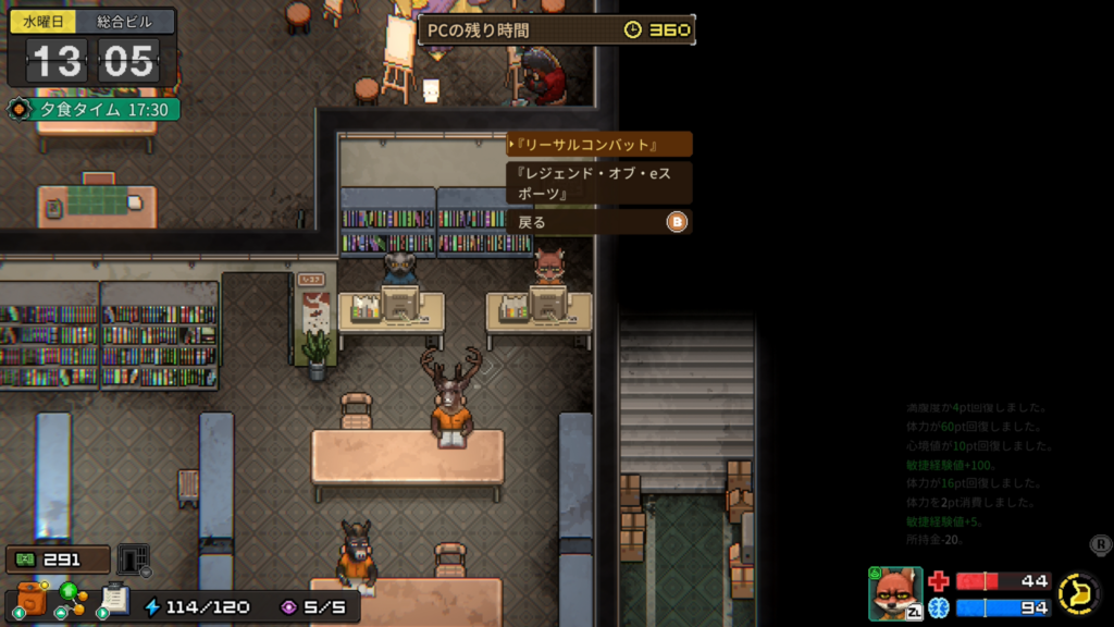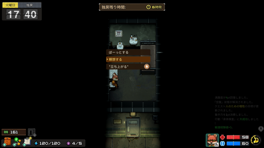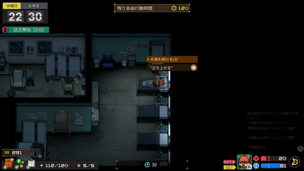 寝心地が悪いため、ここで寝ると健康値に悪い影響を受けてしまい、「ぼーっとする」ことしかできないので、心境値にもあまりよくない。