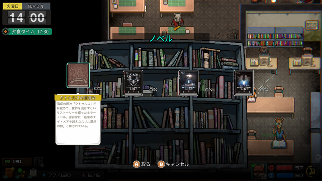 ジャンルごとに分かれている本棚から本を一冊選び、最後まで読み切ると、スキルを習得できる。